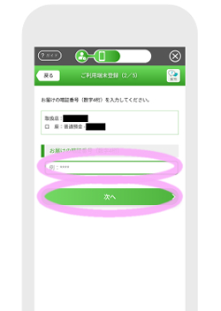 普通預金の取扱店(取引店)や口座番号、暗証番号などを入力すると、利用口座の登録が完了します。