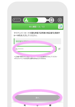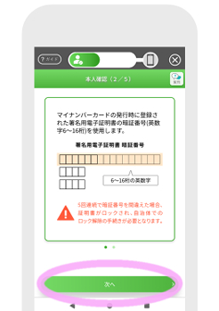 マイナンバーカードの署名用電子証明書の暗証番号(英数字6~16桁)を入力し、「次へ」を押します。