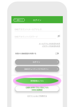 OKBアプリのログイン画面で「新規登録」をタップ!画面の案内にしたがって、OKBアカウントを新規登録します。